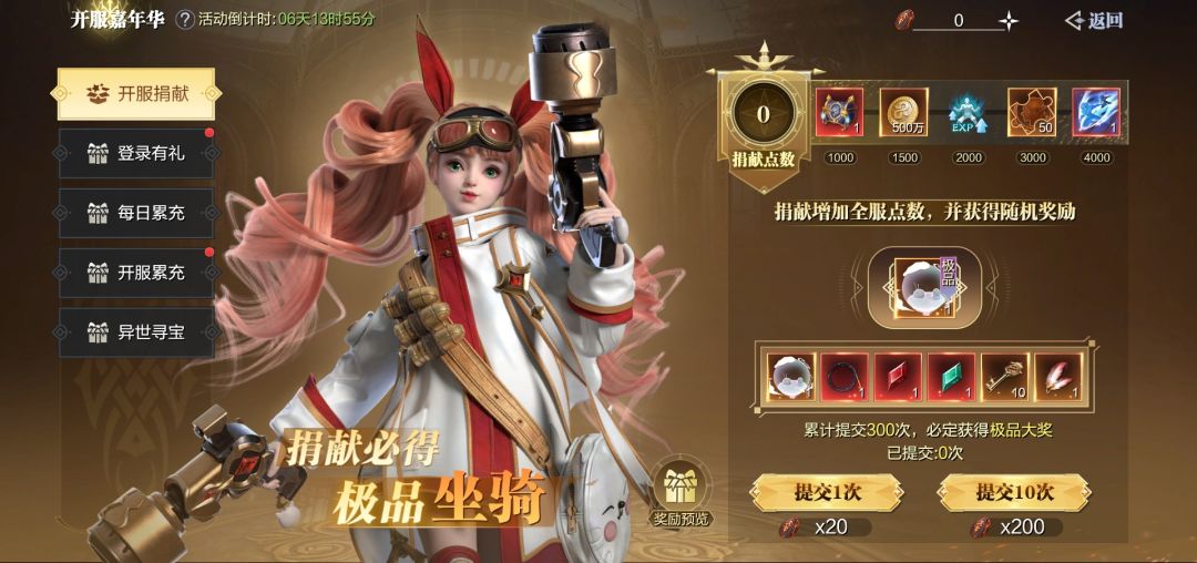 零氪也能畅快抽,开服挑战BOSS、7天登陆等任务和活动均能获得大量捐献道具,每次捐献即可进行抽奖,【SSR坐骑——缤纷雪球】可通过活跃任务免费保底获得哦~同时全服累计捐献达到指定数量,还有SSR战灵和高级战灵技能等惊喜大奖可领取!