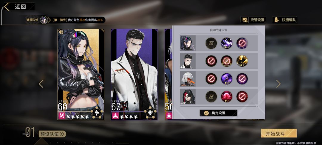 第三个号夹击队(巨灵、诡蛇、车骑士、所罗门)推图体验非常棒,绝大多数副本基本都是没什么压力就过了,打公会boss伤害更是一骑绝尘,甩其他队伍10条街,但是上测PVP被同调队打成渣(我全60级全带专武被45级的同调队干翻了)队伍组成比较容易成型,2金2紫,但是队伍比较慢热,养成成本较大,车骑士和诡蛇需要3破夹击技能才能变成2费,要不然纹章就只能带热血症,巨灵需要60级开出灵纹解放C伤害才高,所以阵容推荐带个所罗门,前中期利用所罗门去越级打本,夹击队的强点在于巨灵的1技能:全体加盾,并附加攻击特效、每次普攻造成目标最大生命值5%的伤害,这个加成在巨灵1破时变为8%