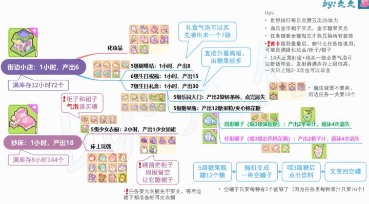 世界榜每天可以点赞5次,每次给5体力。糖果是前期比较难的一个道具 ,后期不缺;衣橱气泡建议买爆,商店少女短裙建议买爆后期需要大量。
