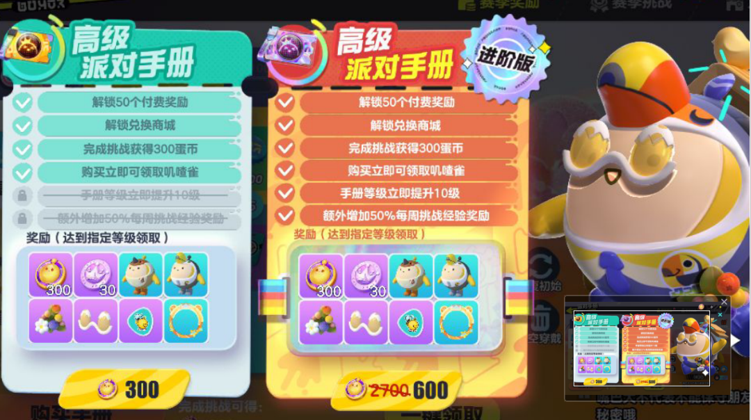 在每季赛季的高级派对手册中的奖励还是蛮丰富的,其中最有性价比的是里面还包含了300蛋币和30彩虹币。花300蛋币得300蛋币等于白嫖,还送30彩虹币。最令贫民狂喜的是,每季赛季的最后一个阶段都会把下个赛季的盲盒首次十连变成五折,刚好只需要三十彩虹币,这样以后的每个赛季你都能白嫖到一次十连抽,简直血赚!虽然手册里的紫色皮肤兑换不了,但是一千手册就能兑换的紫色配饰还是能兑换的。这样手册就能拿到三个紫色配饰,并且与上同理以后每个赛季都能白嫖到三个紫色配饰。关于手册的详情攻略可以看下篇文章具体说明喔~所以如果说666蛋币你还在纠结怎么用的话,那么300蛋币的高级派对手册不用想,绝对可以先无脑入了!超值礼包