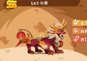 第三只神兽宠物:年兽宠物信息:年兽是古代汉族神话传说中的恶兽。生命成长范围:104-119(变异:114-137)攻击成长范围:143-163(变异:158-189)防御成长范围:71-81(变异:78-93)初始属性:生命:1124,暴击:18%,抗暴:0%,攻击379,闪避:0%,命中:120%,防御:100,攻速加成:0%被动技能:吸血上阵:每次攻击时可回复50%攻击的血量助阵:每次攻击时可回复20%攻击的血量技能看得出年兽无论是上阵还是助阵都是一直不错的神兽宠物。
