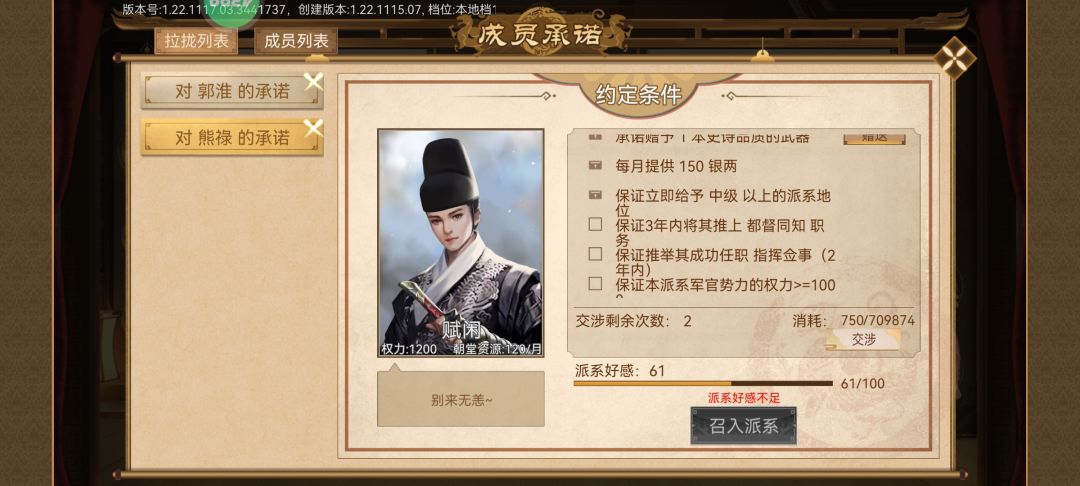 第五:户部尚书了,创建派系把那张独掌大权锦囊卡用了,加个人权力,因为有些人要求需要你个人权力不低于五千,有时候卡着难受。这个时候你分别去客栈当铺八大胡同(八大胡同是京师第三年开启的)触发剧情,然后去涮十二监亲密度。这个时期主要是涮十二监亲密+皇帝恩宠(为了300恩宠拿尚方宝剑,别拉人,拉也只拉十二监里面那些小的3人和小锦衣卫四人)