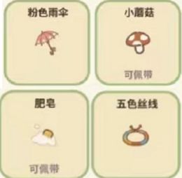 粉色雨伞—非常少女心的一把伞,获取后可以得到40颗星,需要招待老虎15次、小蘑菇—会出现在安静的地方,获取后可以得到50颗星,需要从扭蛋机里获、肥皂—擦地更干净啦!获取后可以得到20颗星,需要从招牌商店里购买、五色丝线—带给你满满好运气~获取后可以得到20颗星,需要从扭蛋机里获取。