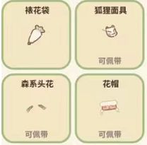 裱花袋—喵克力蛋糕专属裱花袋,获取后可以得到15颗星,需要从扭蛋机里获取、狐狸面具—听说这个面具有很多故事哟!获取后可以得到25颗星,需要从招牌商店里购买、森系头花—干花和落叶做成的,有淡淡的香味,获取后可以得到35颗星,需要从招牌商店里购买、花帽—你小时候有一顶这样的帽子吗?获取后可以得到40颗星,需要从招牌商店里购买。