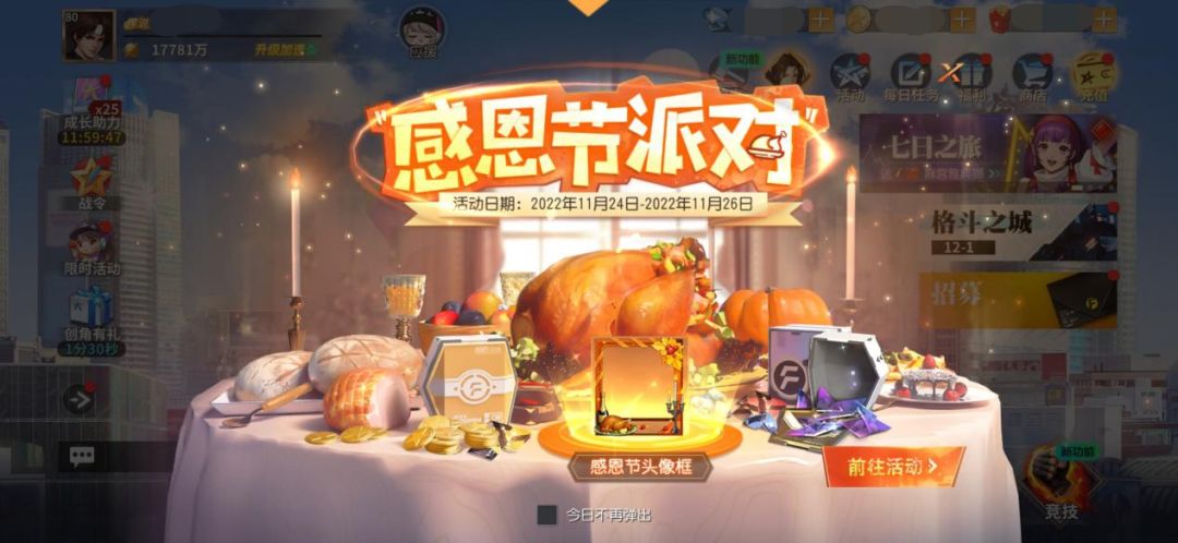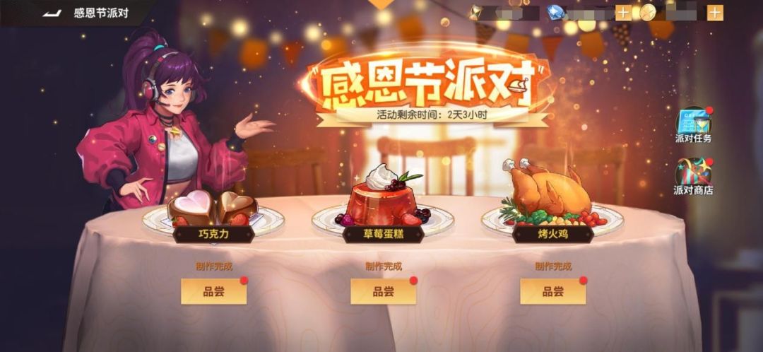 品尝美食的同时大家也不要忘记参与派对任务,完成任务即可获得加速道具,帮助我们更快完成美食制作,期间我们还将开放派对商店,大家可以领取免费派对礼包,最后已制作完成但未领取的美食奖励,大家也不用担心,在活动结束后我们将通过邮件发放到经纪人邮箱中,再次祝大家感恩节快乐!让我们享受这美好节日吧!