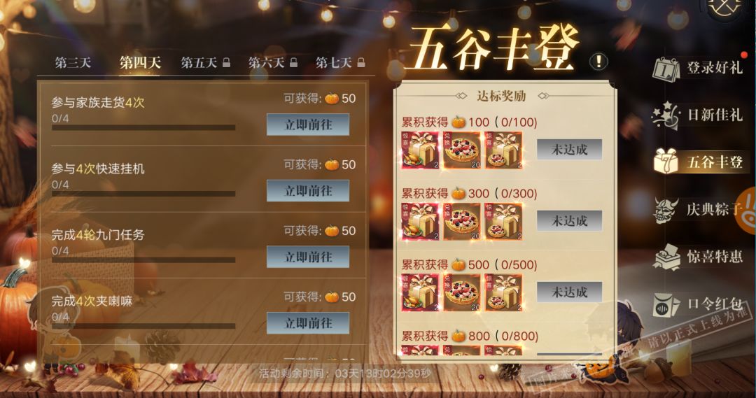 活动期间,九门弟子每日完成任意首充即可领取丰收豪华礼盒*5、幸福甜饼*10、历练时间*200、阴阳符*1。
