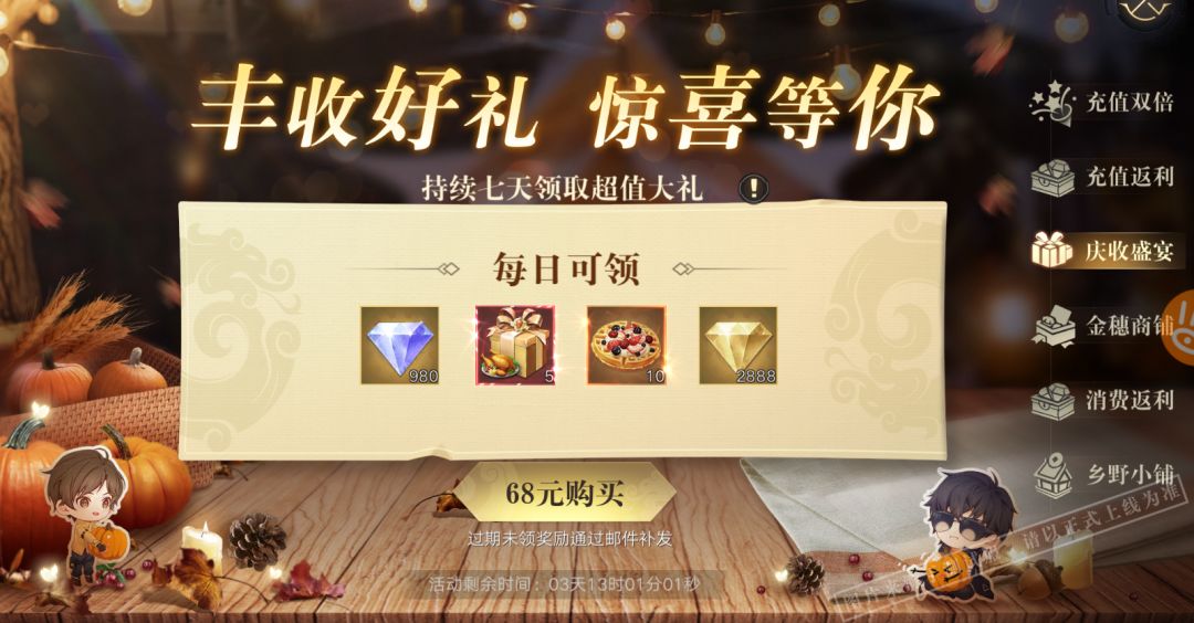 仅68元即可解锁连续7天每天领取超值大礼!每天可领取丰收豪华礼盒*5、蓝钻*980、幸福甜饼*10、金钻*2888,合计可领取蓝钻*6860、35个丰收豪华礼盒、70个幸福甜饼、金钻*20216!超值福利冲冲冲!