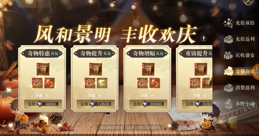 活动期间,期间登录每天领取好礼!活动期间签到可领取丰收豪华礼盒、抽奖券。登录6天更有称号-齿留秋香获取!