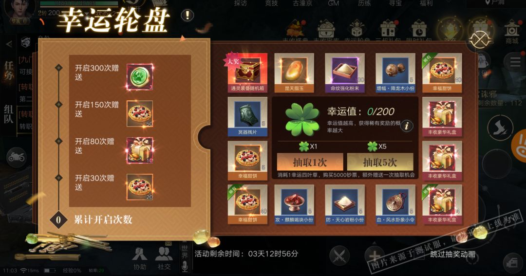 消耗300蓝钻,购买5000钞票,赠送一次抽取机会(可以消耗1500蓝钻进行5连抽)每次抽取将会累计1点幸运值,幸运值越高获得稀有奖励的概率越大,幸运值上限为200,到达上限后下次抽取必中大奖!每次抽取获得大奖后都会清空幸运值。