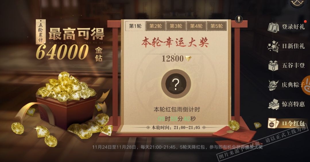 每天晚上五轮天降红包,参与就有可能获得12800金钻大奖,每日最高可获64000金钻!