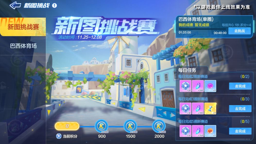 11月25日-12月8日期间将开启新图挑战赛,车友们完成新图挑战,即可获得奖励和积分。奖励包括时间沙漏、紫色幸运币和橙色幸运币,而积分可用于兑换酷币。活动结束时,计时挑战成绩排名在全区前100名的车友,可获得新图拓荒者*30天称号哦~