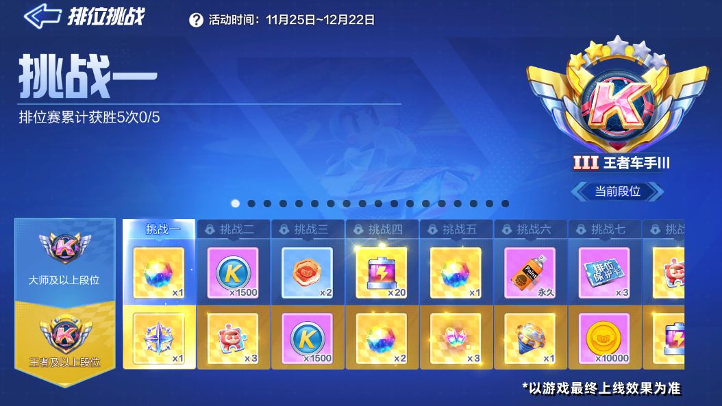 1、排位挑战赛将在每赛季末开启,车友们需要完成不同的挑战,赢取丰厚的奖励。