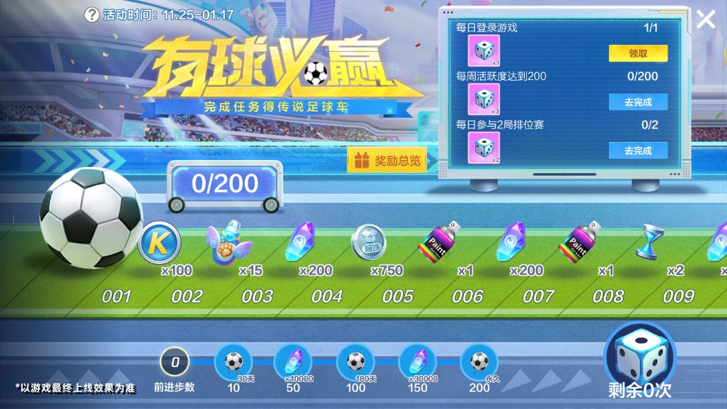 在11月25日上线的【有球必赢】活动中,车友们通过参与指定任务后可获得掷骰子次数,掷出骰子驾驶着这辆足球赛车一路前行,在前进的过程中达到指定步数即可获得包含传说级道具赛车【足球】在内的大量奖励!