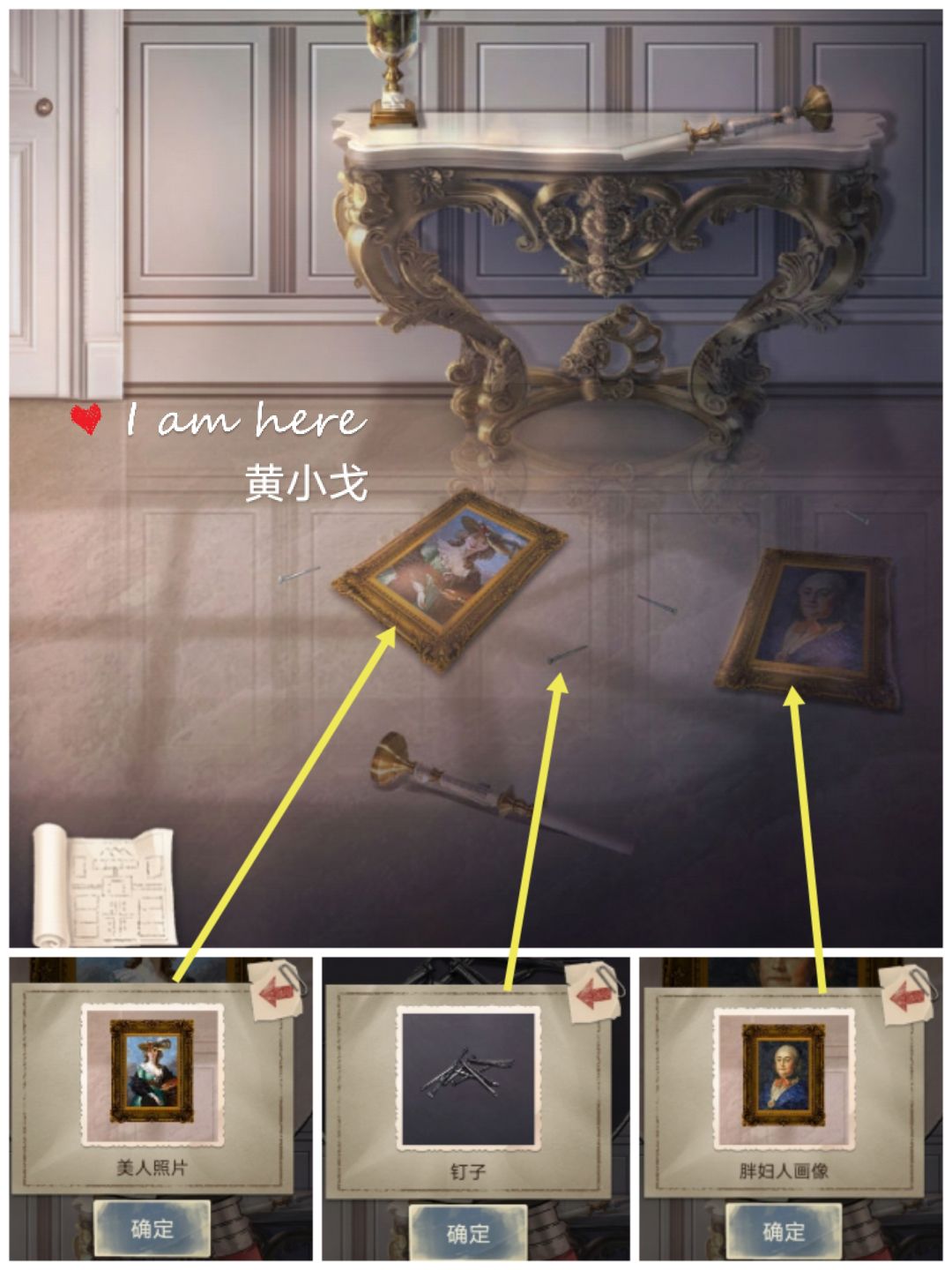 1.地面:【美人照片】、【钉子】→可疑的痕迹、【胖妇人画像】
