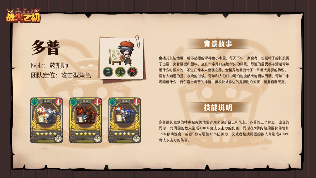多普的三个梦之一出现的同时,对周围的敌人造成 400%魔法攻击力的伤害。同时在9秒内给周围伙伴增加 15%移动速度,或者 9秒内增加 15%防御力,又或者拉拽周围的敌人并造成400%庵法攻击力的伤害。
