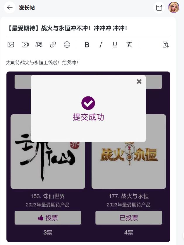 4、开帖后,在自己开的帖子下晒出投票完成的页面即可参与,活动示例: