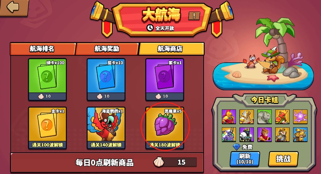 首先来到恶魔果的发源地(从主界面活动进入),全天开放的大航海,只要通过第180关即可解锁5个恶魔果。