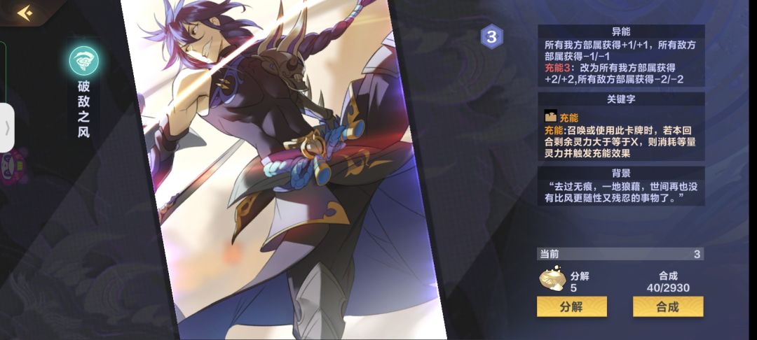破敌之风!这卡很强啊,3费我方全体+1+1敌方全体-1-1。-1-1是可以破不屈的。直接把血扣到0点,而且还能buff我方的怪。快攻内战神中神。打慢速充能后也是神中神。非常强力。拉满!