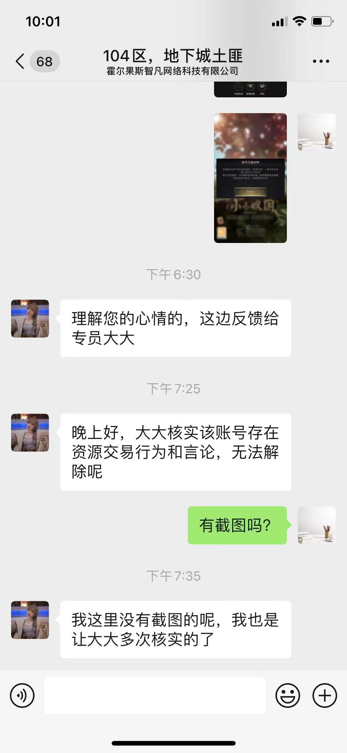 上面是与微信专属客服的聊天记录 自己练个小号打了几车资源 就被判定为贩卖资源?让拿出证据又没有 战斗记录全是我大号打的。大号ID:地下城土匪 小号ID:破萝卜 微信专属客服也解决不了 电话人工也打不通 真就有苦不给诉