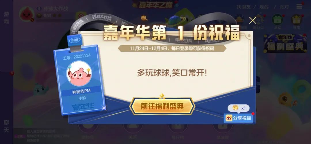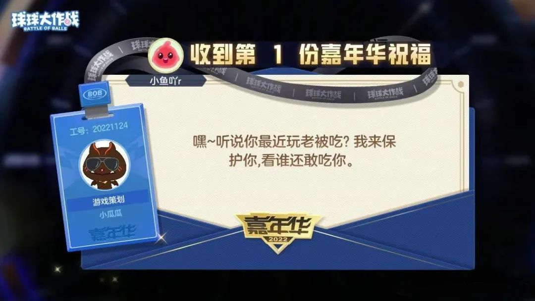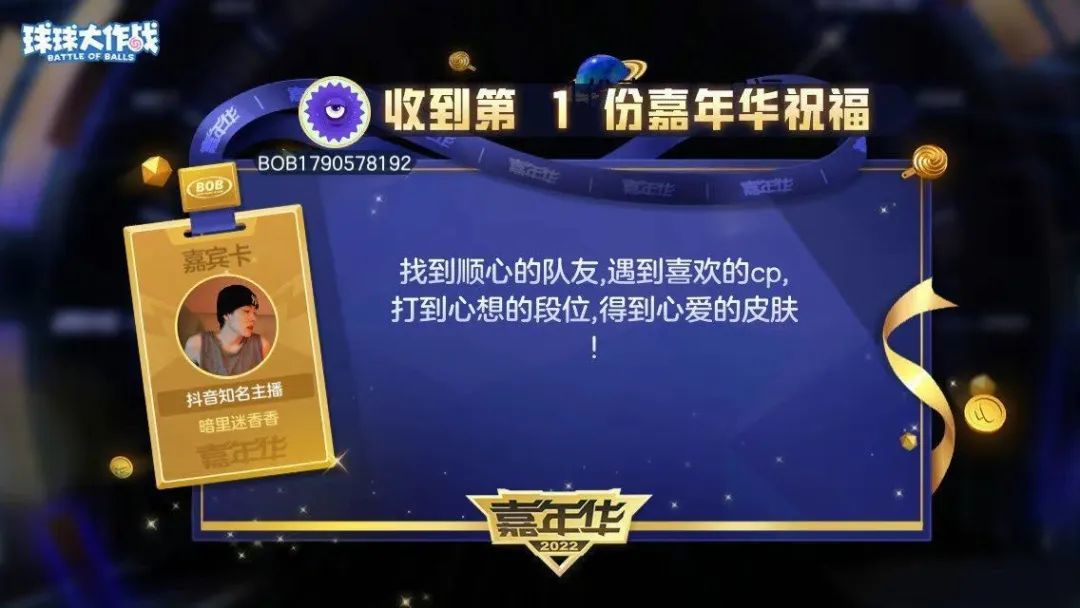 球宝们有没有收到来自2022嘉年华的祝福呀,我们的策划大大、美术大大还有神秘大神主播都为球宝们写下了祝福,每个人每天收到的祝福都不一样哟~
