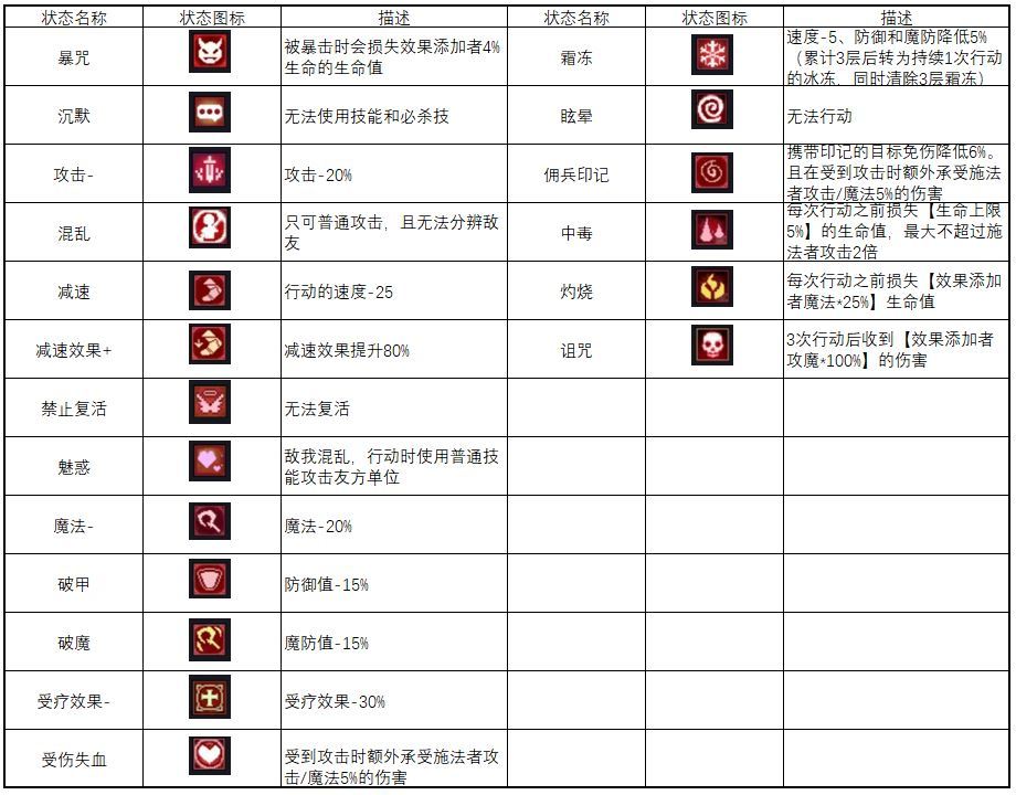 今天给大家带来的是各自Buff与DeBuff的汇总,当然不是很全,我会逐步完善的。另外,对于buff的加成数值,会有浮动与不同,表格列出的数值仅供参考。如果你还见到了奇奇怪怪的Buff,还请给我留言截图,我慢慢添加完善哟~