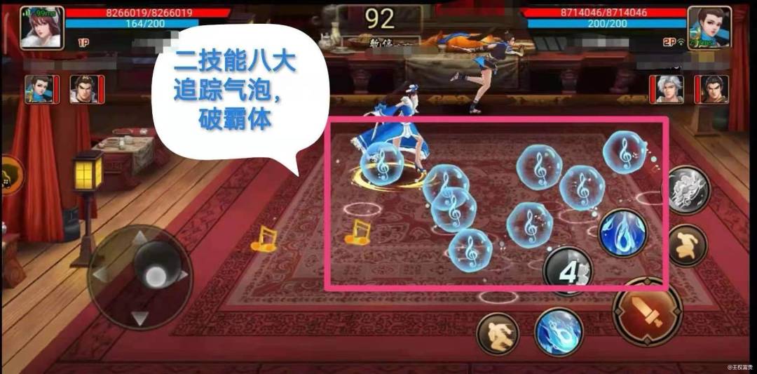 如果不使用1技能先手时,同样可以使用2技能先手,无论是冲上去霸体强吃对手,还是利用泡泡追踪围堵对手都可行。泡泡命中对手后,再通过3技能的全程破保护优势,进一步连招,从而顺利带走对手。2技能先手的连招方式一般为2+3+1