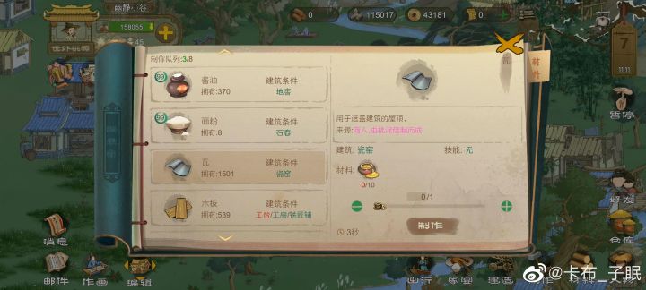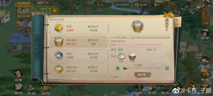 🍉总结:制作铁匠铺买买买大法好!!你刷廖溪村好感度的拨浪鼓拿来换钱然后直接去买不香吗?还不用你使劲肝。糯米砂浆可以自己做。其他三个材料直接去枫渡岭买,缺几个买几个。缺钱就做点手工艺品买给商人。尽量一次就把钱带够,毕竟前期粮食也很缺,跑多了浪费粮食。缺出行粮食的话可以买点小麦种子做饼,桃子什么的也攒攒,攒够就出行去。注意不要跑错村庄就行了。家里来了商人也可以看看你缺什么材料,就买下来,这样去枫渡岭就只买东白石了。制作铁匠铺千万不要去刷好感度!!!!!直接带人出行去买!! 你再刷好感度我开叉车叉你!!!