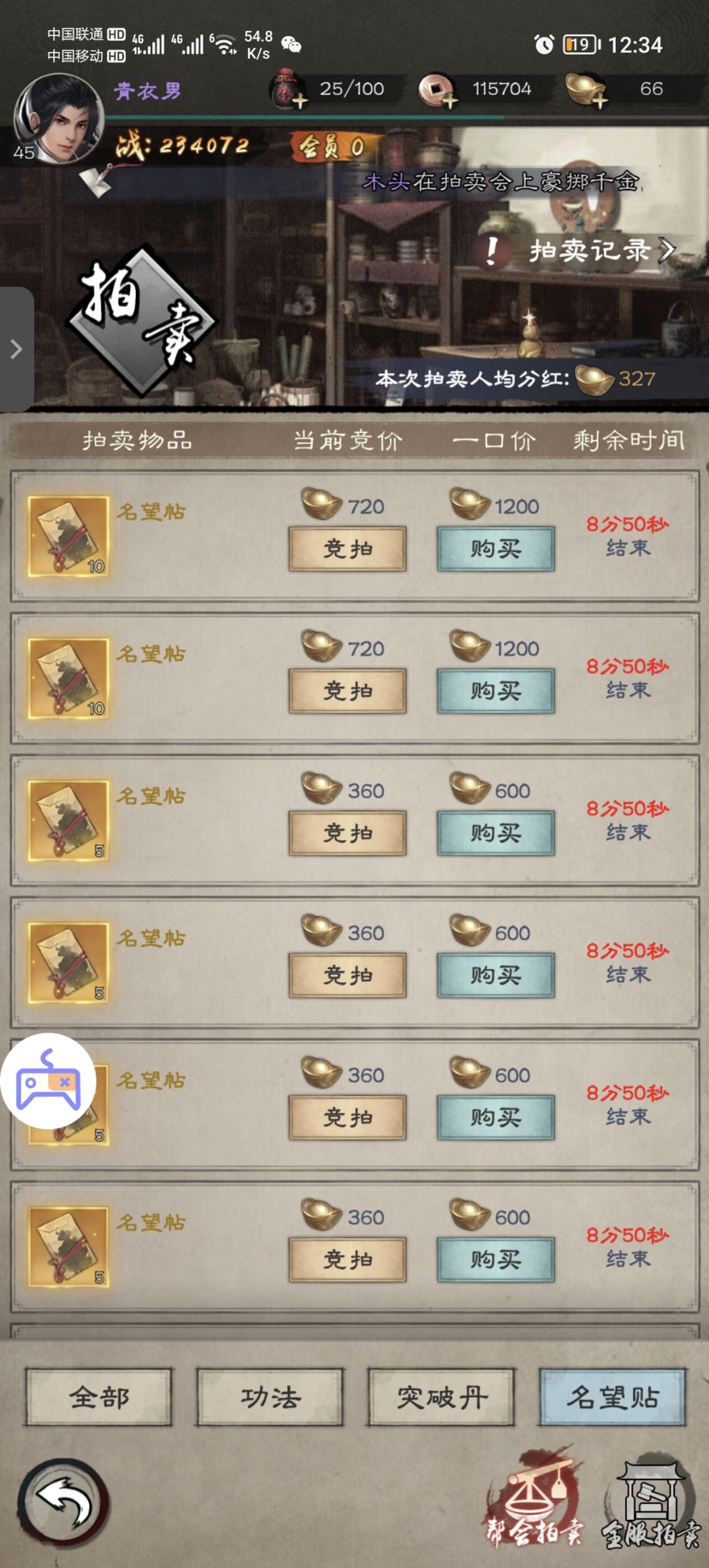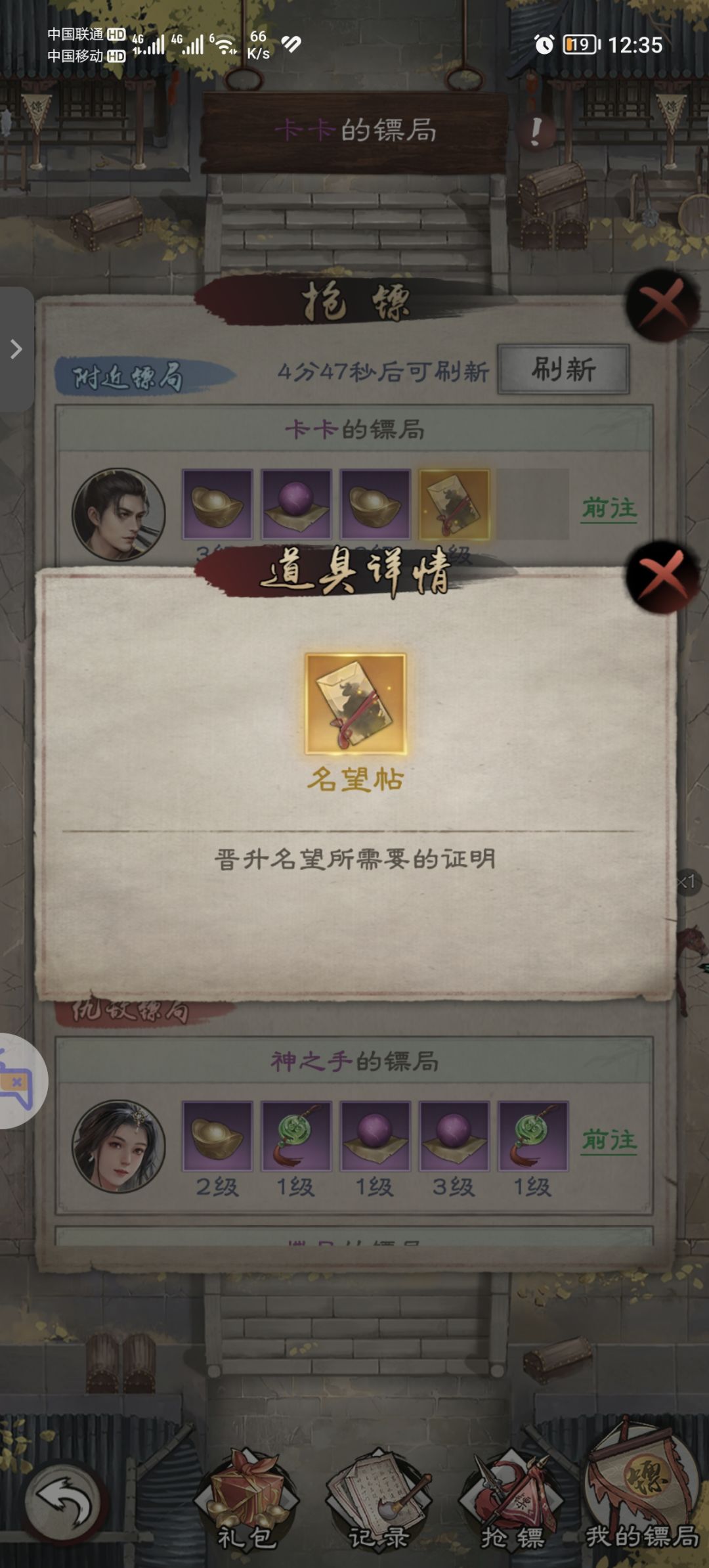 名望等级对于前期来说是非常重要的,因为他关乎你能否上阵五个或者六个侠客。而升级名望所需的名望帖大量产出方式只有拍卖行。名望帖拍卖行玩法是10张720元宝起拍,5张360元宝起拍,所以各位侠客按需“趁早”拍卖。(直接秒的大佬随意)第二个少量产出方式则是镖局,所以各位侠客随时盯着镖局吧!