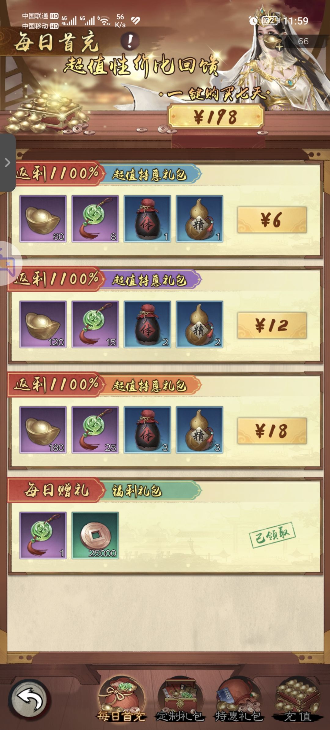 首充根据个人意向,首充六R送的金色品质小昭在前期特别有用!三十R包含的金色功法(昆仑两仪剑)以及十张功法帖(藏经阁元宝抽取五连抽两次)也对战力提升有很大的帮助,之后的首充按各位大侠按需买!