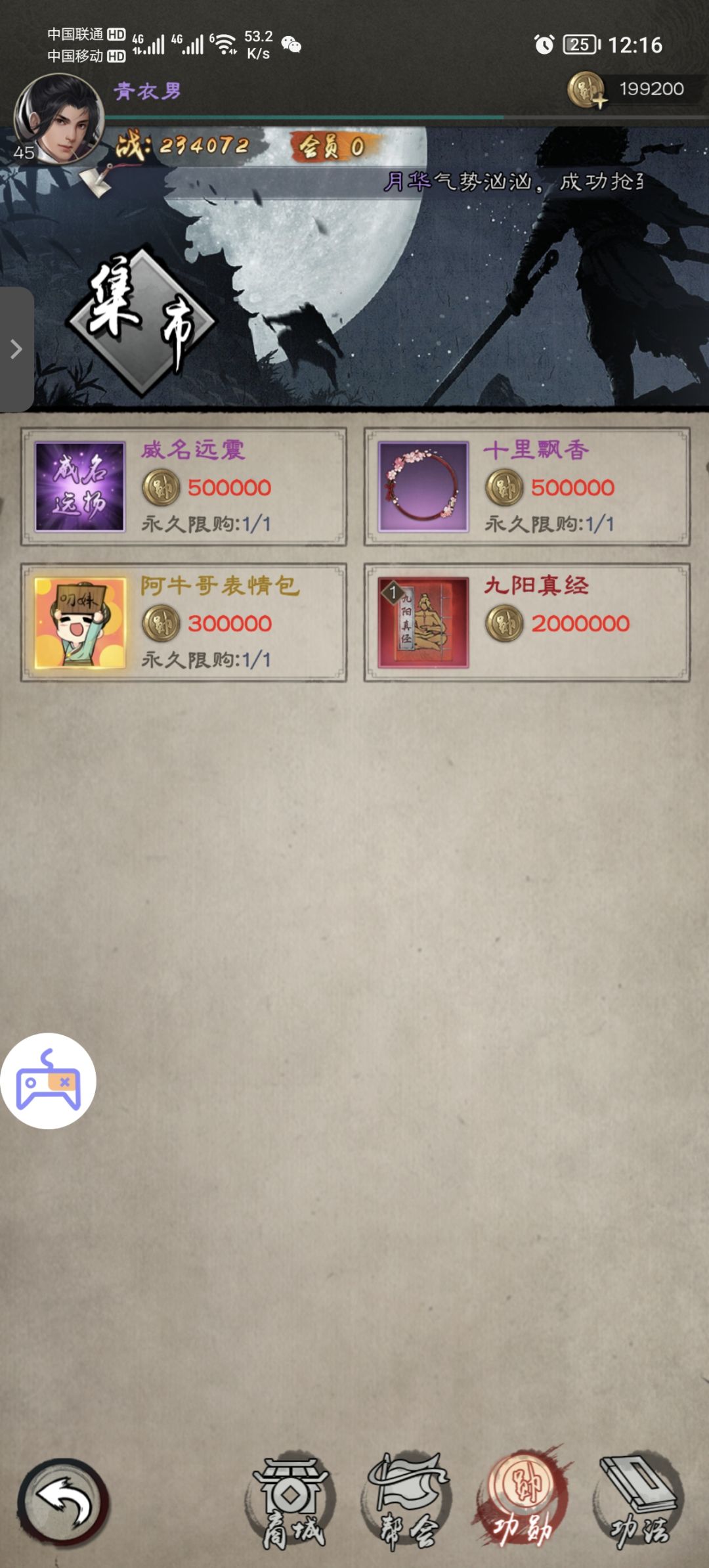 功勋商店内(威名远震)称号的功勋需求是50万,称号加成属性在前期也是可观的。并且还有(九阴真经)红色品质功法的兑换方式,所需的功勋需求要200万功勋兑换(无限次数)!由此可见功勋的需求量是特别大的,而唯一的产出方式是游戏内的江湖玩法。