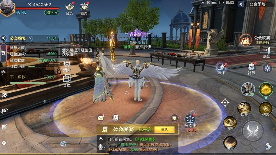 (1)公会晚宴:每晚19点至19点15分开启,勇士们可以进入公会领地,参加烟花、答题、BOSS挑战等活动,将获得公会贡献、角色经验值奖励。参与放烟花的公会成员越多,经验越丰厚哦,记得多呼朋唤友一起参与公会晚宴~