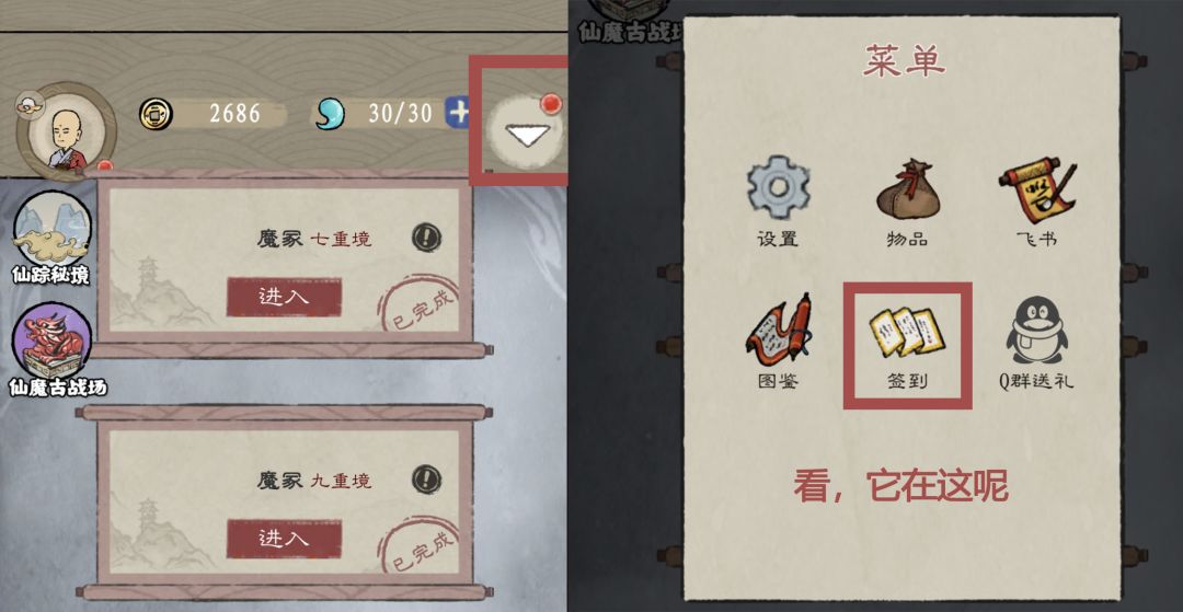 签到福利:看到右上角三角形了吗?对,点他,然后就会弹开功能页面,<签到系统>这不就找到啦~