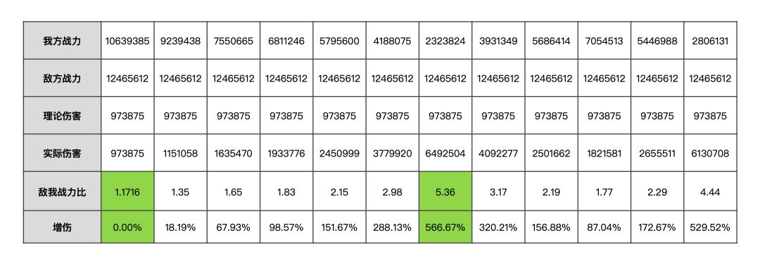 仅改变我方战力,测试了多组大禹一技能对我方造成的伤害,原始数据如下。