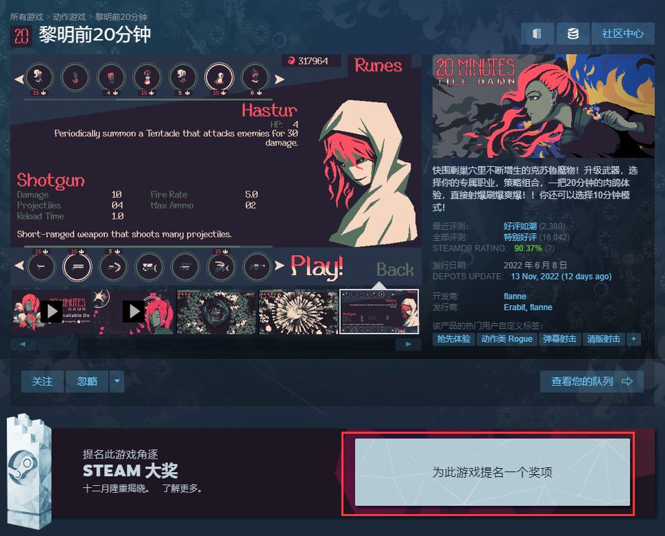 如果你已经有《黎明前20分钟》Steam版本并且希望继续支持我,希望你可以抽1分钟时间到Steam商店点击"为此游戏提名一个奖项“”为《黎明前20分钟》