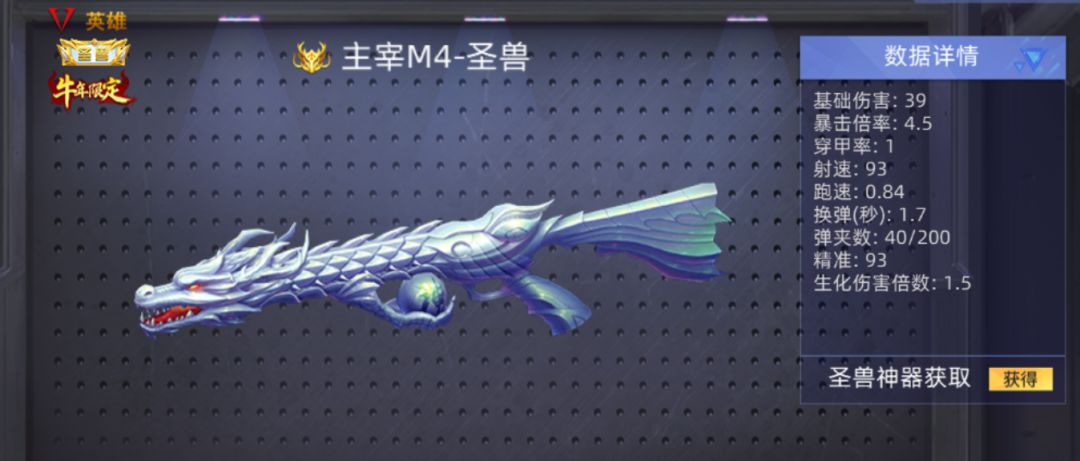 基础伤害39,暴击倍率4.5,穿甲率1,射速93,跑速0.84,换弹1.7,弹夹数40/200,精准93,生化伤害倍率2。前步枪天花板,拥有超级炫酷的外形,和齐天大圣一样也是可以在近战武器和步枪之间切换,虽然是前天花板但是在枪神这款游戏中也是最巅峰的步枪之一!