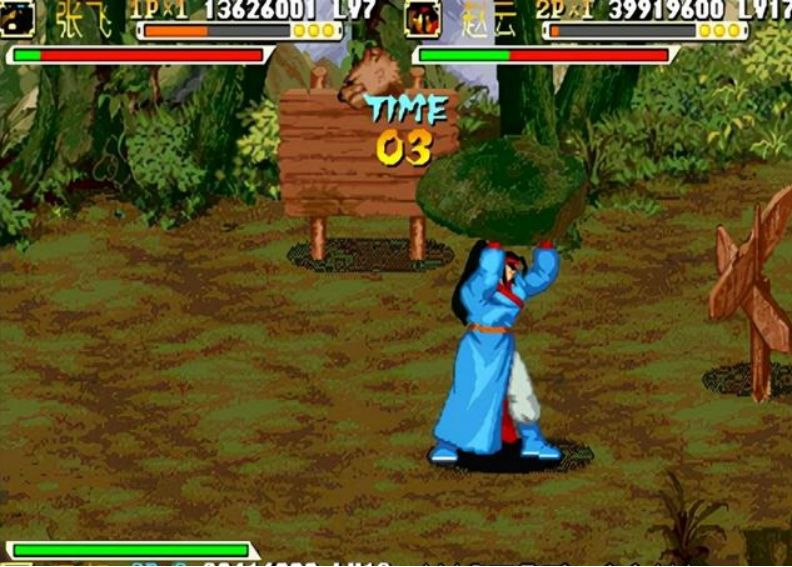 这个设定也再一次证明了《合金弹头》这款游戏在细节处惊人的铺垫,难怪在二十多年的时间里,它仍然是街机游戏最具代表性的射击游戏之一。和《合金弹头》一样,为了突出真实而被加入的设定其实在《三国战纪》中也有体现,比如第三关出现的大量动物杂兵虎豹熊等,玩家可以举起地上的石头砸死。