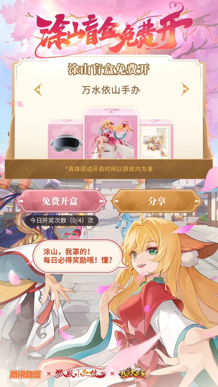随着苦情树与红线仙的到来,《我是大东家》游戏内外还将举行一系列有奖活动,游戏内将在12月2日开启【涂山盲盒免费开】惊喜有奖活动,涂山红红金羽华裳系列周边整套、涂山苏苏万水依山手办、超多游戏限定礼包、京东卡以及pico 4 vr 一体机隐藏大奖正待大家领取!