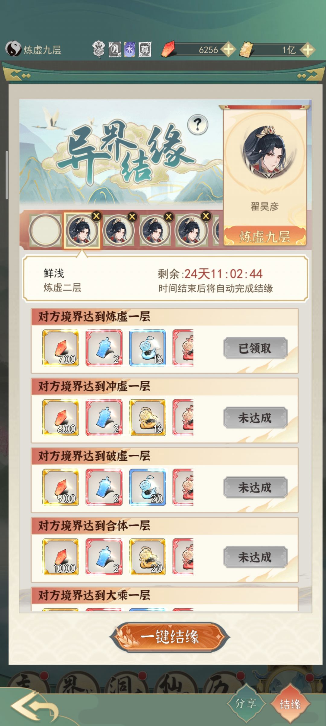 到达金丹后每个人都有一个自己的结缘码,别人填你的结缘码到一定境界都有奖励,一个号到冲虚就能获得3600仙玉,5个号就有18000。2个月可以开3组小号,这奖励诱人,所以肯定得搞起来。