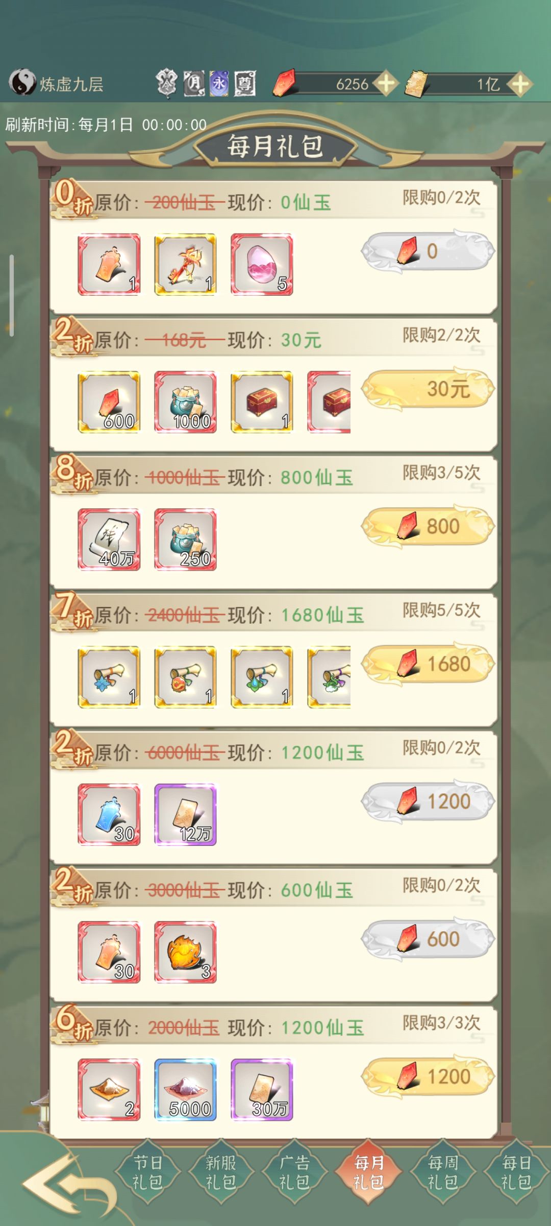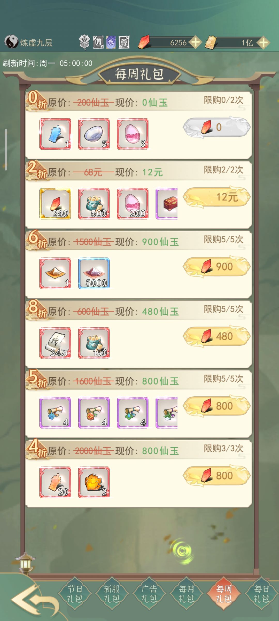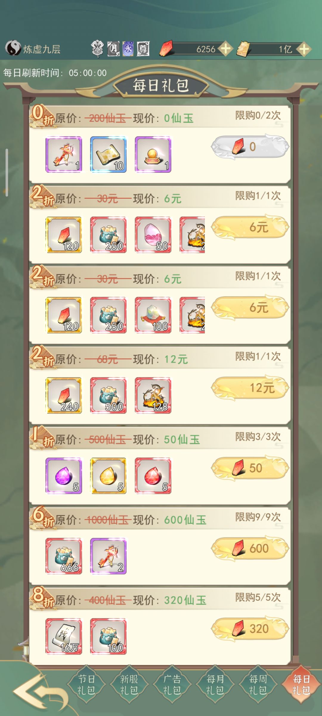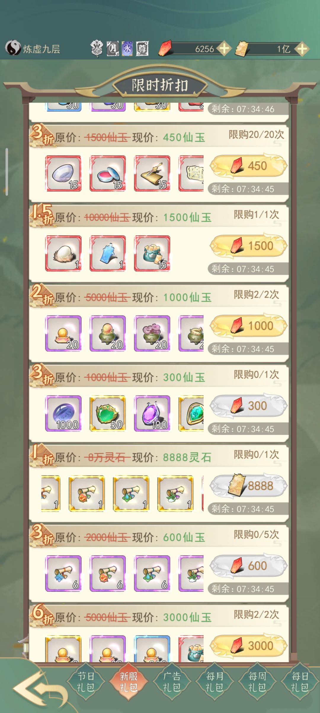 新服礼包:每天刷新,灵石购买的全买,300的进阶玉可以买(前期适当买几天就行了),600的卷轴看自己选择(有自己肝小号结缘要冲境界可以买,即使买就买个5-7天左右),750的徽章不建议买,血亏