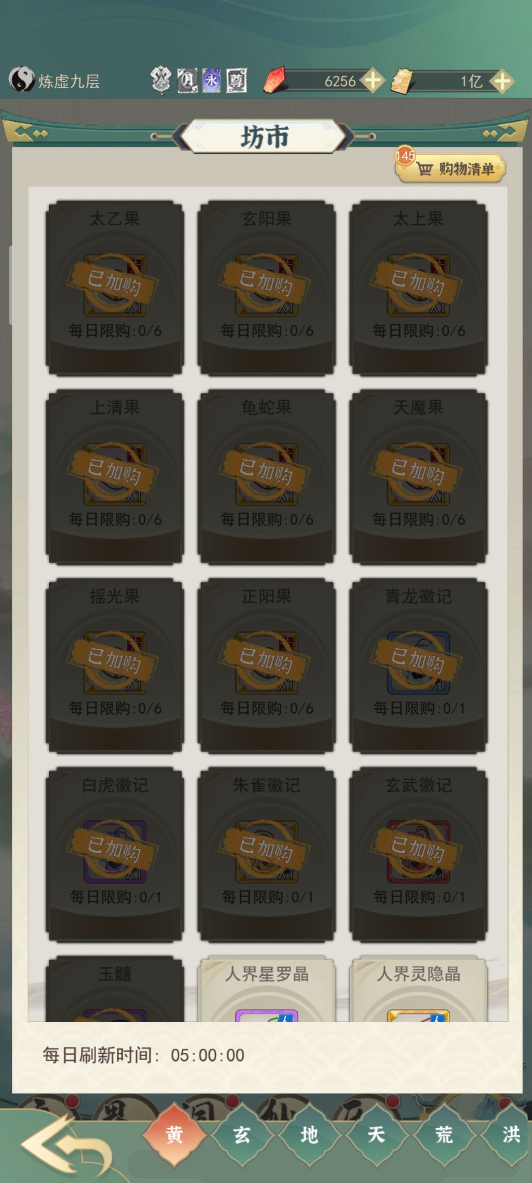 坊市每天5点刷新,丹药全买,人界惊虹草,人界含光草买满,虚空石,修为钥匙跟灵气钥匙买满,青龙白虎买满(冲虚后如果零食存不多可以不买)。五行灵精建议按需求购买,不然飞升灵界灵石不够。破虚最好存几亿灵石买书页,越多越好。
