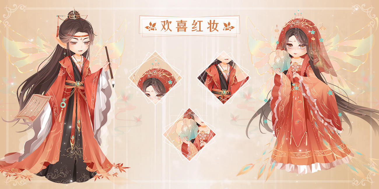 集齐欢喜红妆套装,可以获得欢喜红妆五官,集齐奖池后赠送:喜冤家团扇(女)/恨无常毛笔(男)、绣球缘贴纸、高烛照红妆贴纸、“只恐夜深花睡去”称号。
