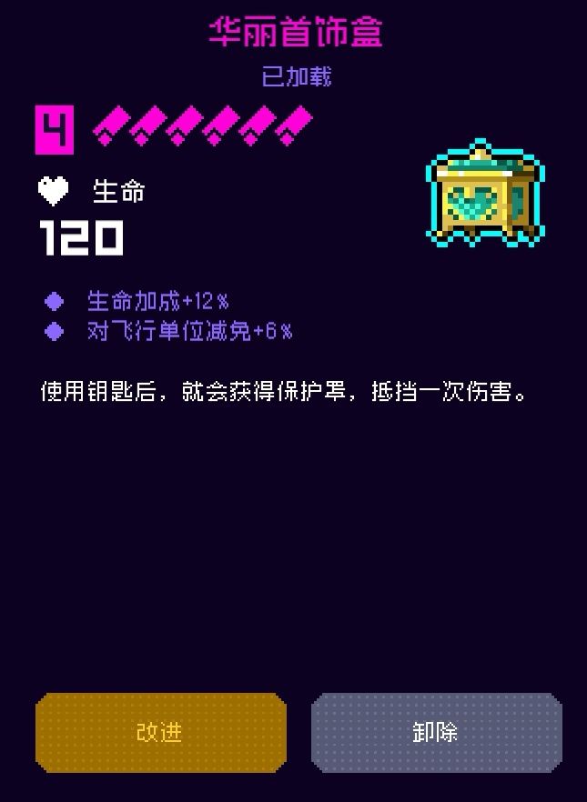 本套装实现的根本之一:在使用钥匙后,会生成一个能抵挡任意一次伤害且持续时间无限的保护罩(能带到下一层)