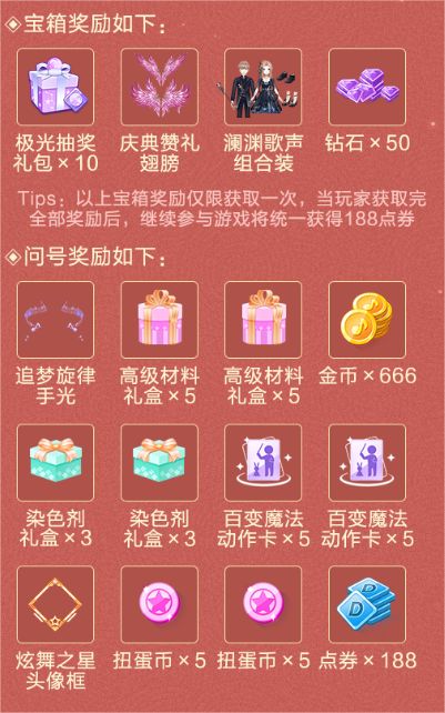 通过投骰子可获得极光抽奖礼包*10、庆典赞礼翅膀、澜渊歌声组合装、钻石*50(以上宝箱奖励仅限获取一次,当玩家获取完全部奖励后,继续获取宝箱奖励将统一获得188点券)、追梦旋律手光、高级材料礼盒*5、金币*666、染色剂礼盒*3、百变魔法动作卡*5、炫舞之星头像框、扭蛋币*5、点券*188等落脚点的奖励。玩家每经过一次起点还将会获得钻石*10的奖励哦!