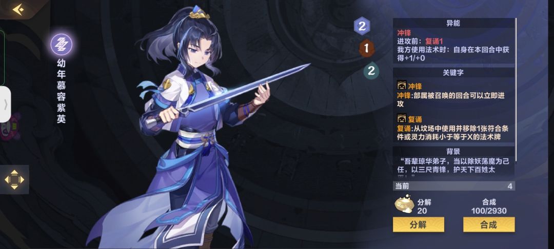 幼年慕容紫英!人称小紫英,快雷核心卡之一,冲锋+进攻前可以快速的触发复涌效果,复涌效果触发可以触发自己和蛇妖男的加攻,琴的打2非常的厉害。