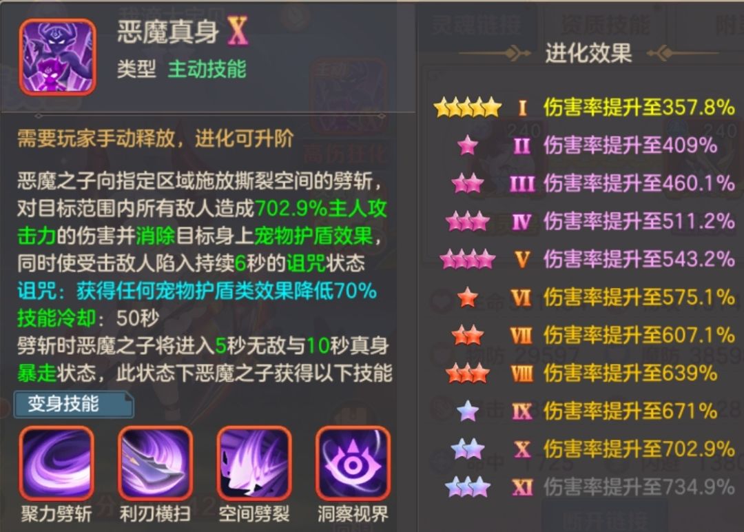 恶魔真身对目标范围内所有造成主人攻击百分比的伤害并消除目标身上的宠物护盾效果,同时使敌人陷入持续6秒的诅咒状态。恶魔诞生的等级阶段在70多级,在这个等级阶段的玩家,多数都是带着暴雪兔、冰甲熊这类盾宠,因此恶魔之子的破盾效果在这个阶段是一个大杀器非常强势。随着等级的上升和新的精灵兽的诞生,恶魔技能的破盾效果和伤害不再像前期那么耀眼,天赋技能应运而生,今天我就跟大家解析一下恶魔之子三大天赋技能以及后期的运用思路。