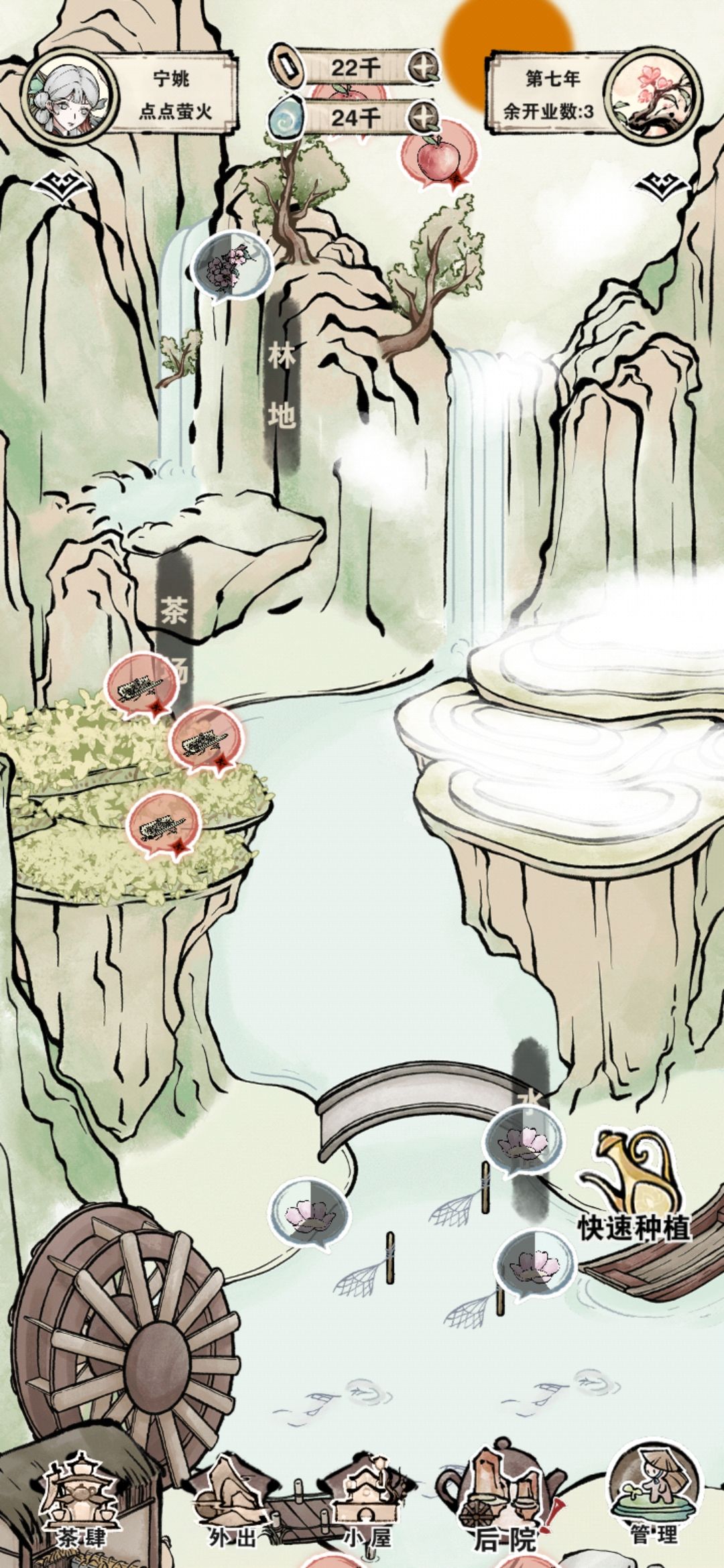 看季节种地 季节可以看广告切换 季节适宜产量最多 比如春天 林地种樱桃奈 茶田种九曲红梅茶 河里种井水引 农田种大麦