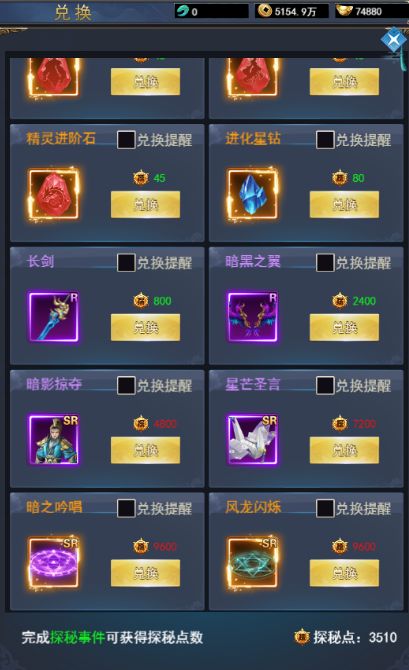 游戏内可通过完成奇遇任务获取探秘点,拥有足够的探秘点可以在奇遇商城里购买提升战力的强力道具和稀有化形。