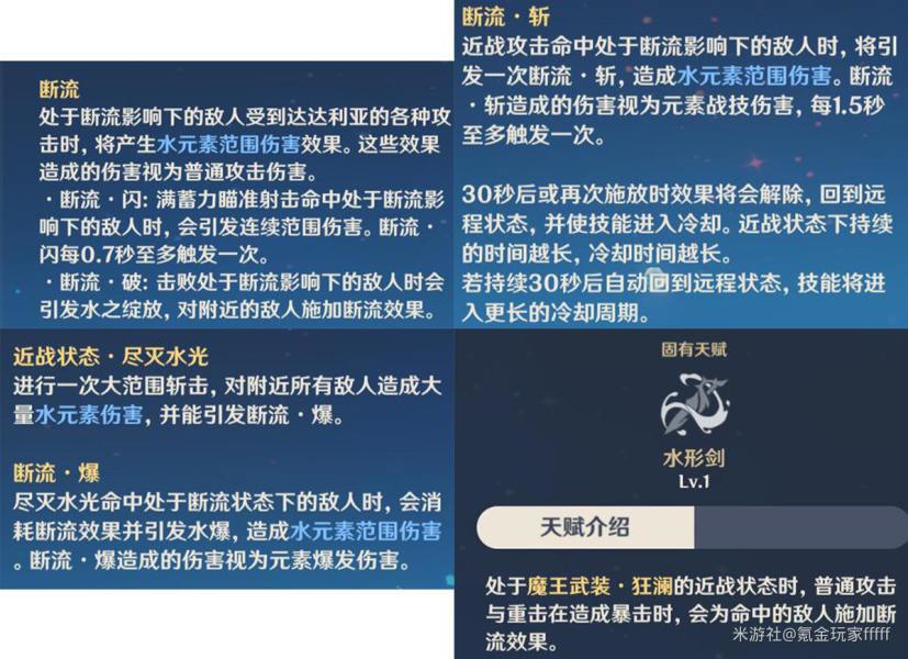 如图所示,“断流”就是公子的核心机制,但是光这么看可能会看不懂。独角兽简化一下解释,就是平时开启战技后变成近战攻击,攻击的过程中会在敌人身上打出各种断流效果,断流效果会在标记敌人的同时对他和周围敌人造成范围水属性伤害和水属性附着。开启元素爆发后,范围内敌人头上的断流标记会被引爆,造成高额水属性伤害和水属性附着。 打败断流标记的敌人时,会把周围的敌人用断流效果标记。 概括就是,公子的普攻、战技、元素爆发都会给敌人造成范围水属性伤害和附着,且范围内敌人越多伤害越高。关键词:范围/水属性/水附着