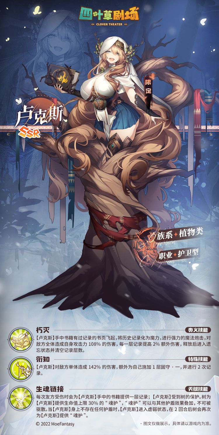 卢克斯,自弗拉米尔的圣树中诞生,是承载着民众祈愿的树灵,由于天性温柔善良,所以展现出圣洁的美丽形象。