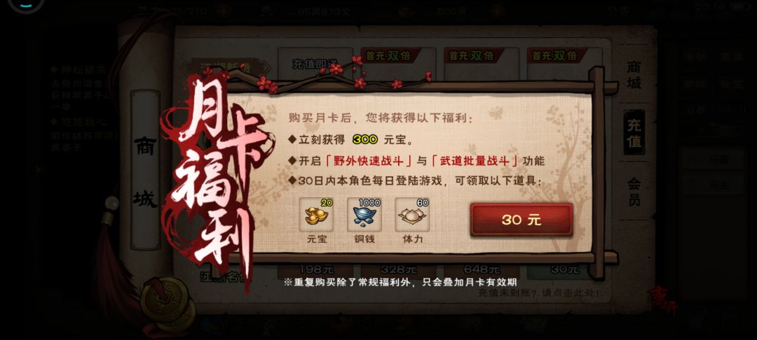 我已经3天没有月卡了,天一教,枯骨门都是可以挂机刷了,所以没有必要充月卡了。